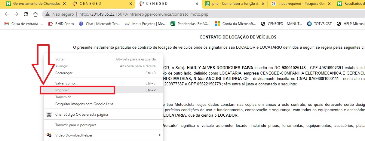 Para gerar CONTRATO DE LOCAÇÃO DE VEÍCULOS recomendamos a utilização do navegador Chrome e siga o passo a passo abaixo: