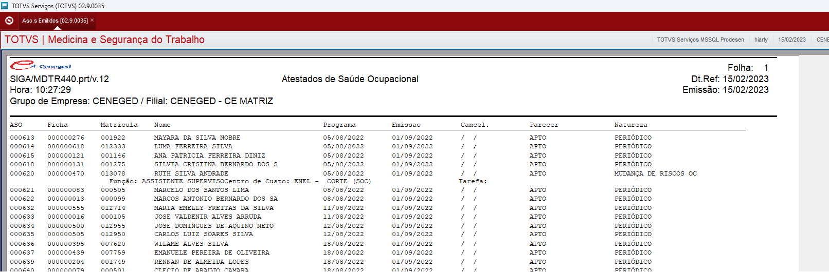 O usuário pode informar o período desejado, será apresentada a relação de funcionários que já realizaram o exame de avaliação clínica para geração do ASO.