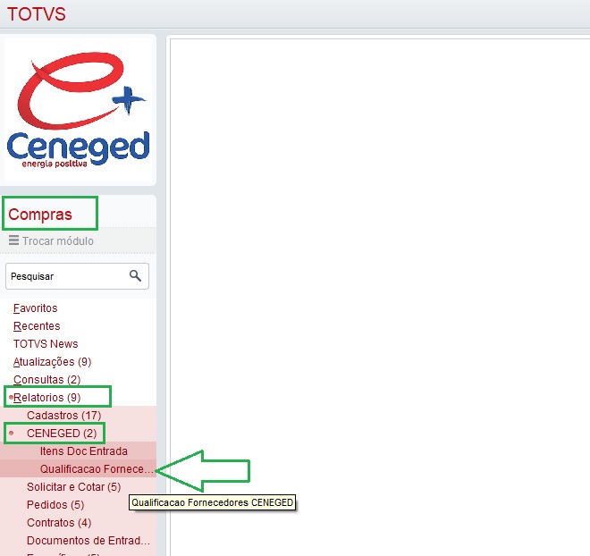 01) Acesse o módulo SIGACOM - Compras e navegue até menu Relatórios >> Ceneged >> Qualificação de Fornecedores
